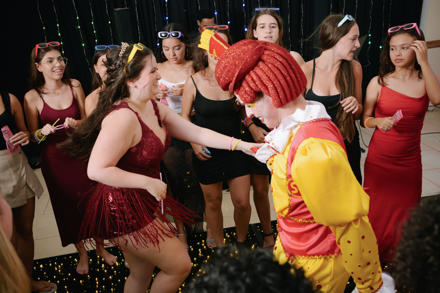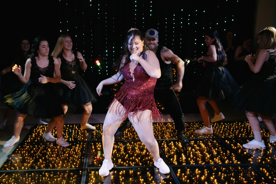 A pista ferveu! Debutante com vestido vermelho e amigas dançando a coreografia na balada de 15 anos em Jacareí.