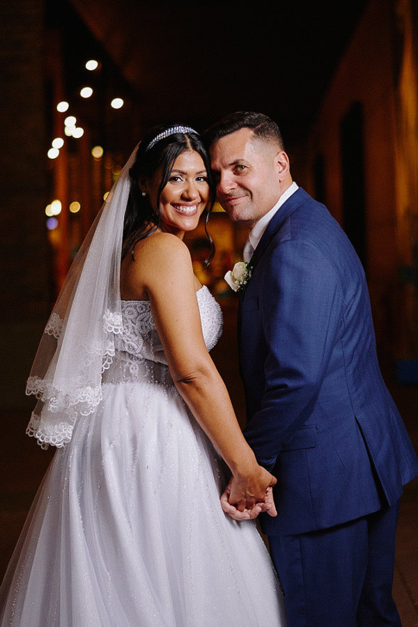 Retrato noturno e romântico dos recém-casados Marcela e Fernando. Eles sorriem para a câmera de mãos dadas, com luzes desfocadas ao fundo. Fotografia de casamento em Jacareí capturando a felicidade do casal após a cerimônia.