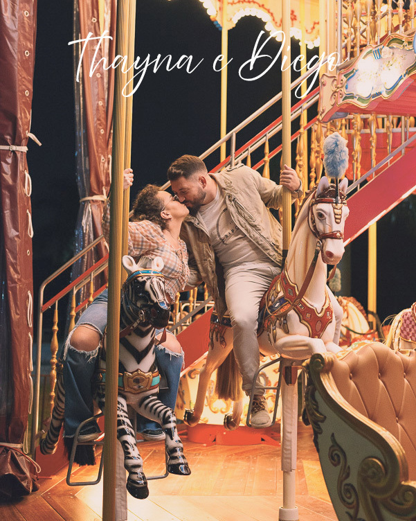 De lá, seguimos para o Parque Villa-Lobos, onde buscamos um toque lúdico. O Carrossel do parque nos transportou para uma atmosfera nostálgica e romântica. Cada giro trouxe sorrisos e olhares de cumplicidade, criando imagens repletas de cor e alegria.