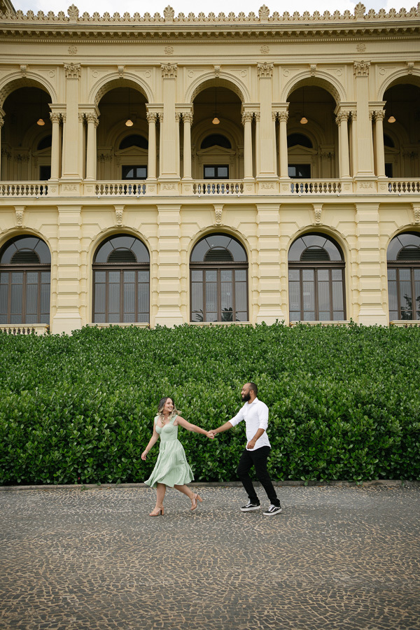 Claudia e Matheus descem de mãos dadas a imponente escadaria de pedra do Museu do Ipiranga. Claudia veste um vestido verde menta e Matheus camisa branca. Ao fundo, a grandiosa fachada neoclássica amarela com colunas e arcos destaca a elegância do casal.
